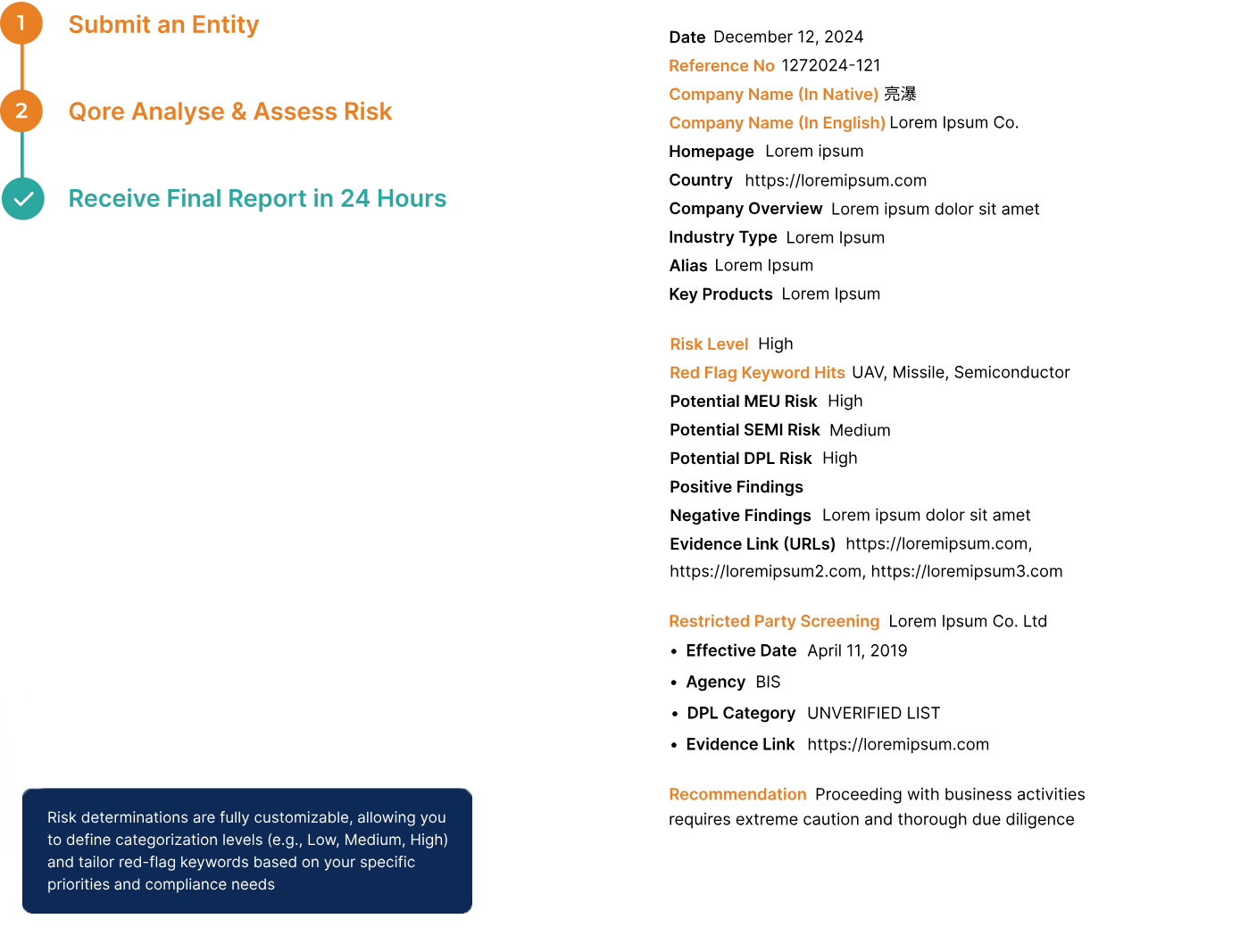 Access curated insights, traceable data, and entity-specific risk levels to make informed decisions on approving or rejecting business opportunities